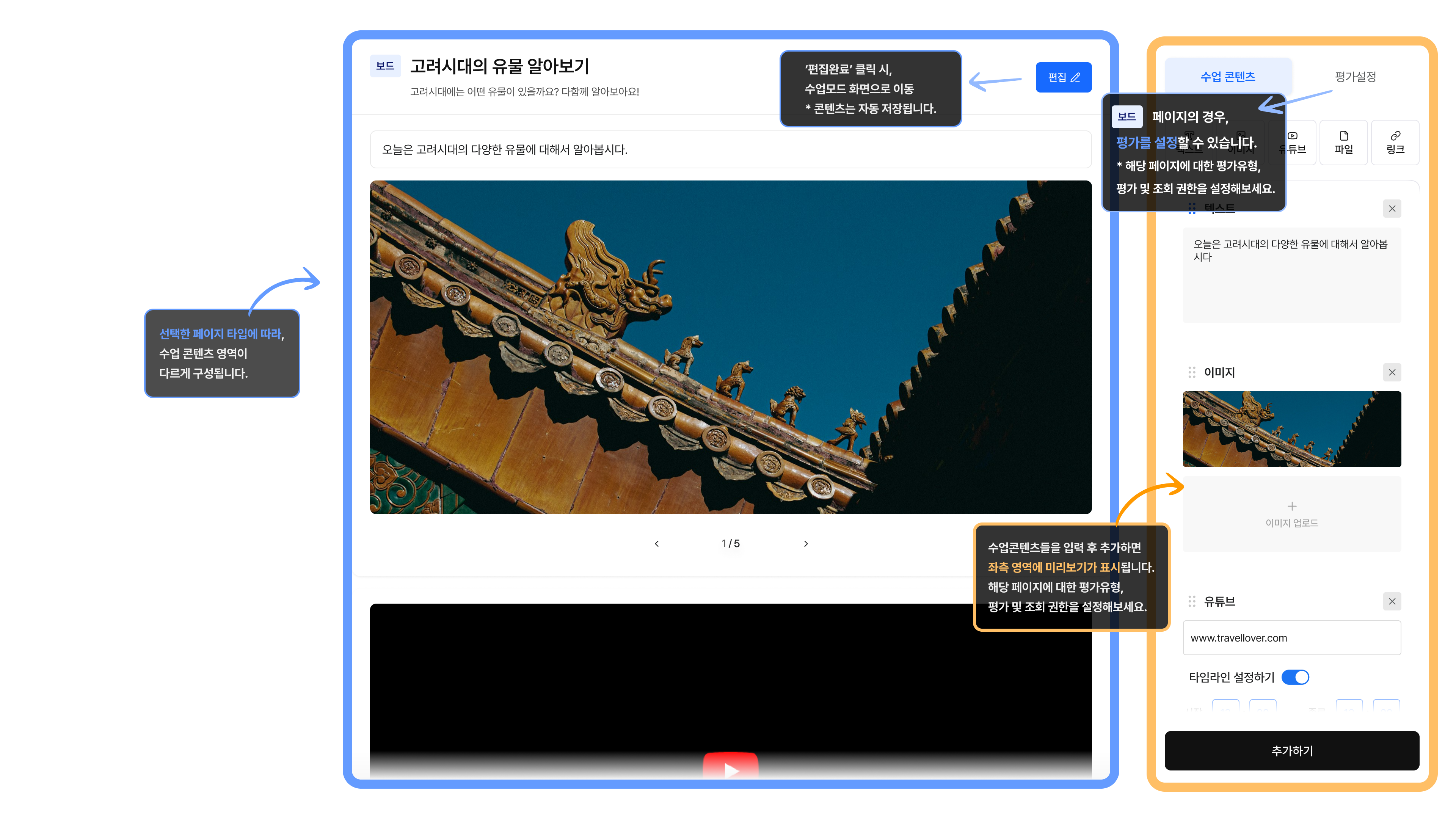 * 텍스트, 이미지, 동영상, 파일, 링크 로 수업을 구성하고