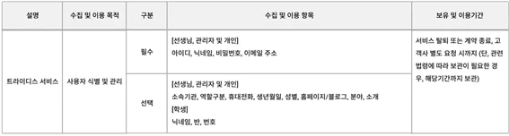 ㈜트라이디스(이하 “회사”라 한다)은 고객의 개인정보 보호를 매우 중요하게 생각하며, 「개인정보 보호법」 등 관계법령의 준수뿐만 아니라 개인정보의 오남용, 유출 및 이에 따른 피해를 방지하기 위하여 최선의 노력을 다하고 있습니다.회사는 트라이디스 서비스에서 고객의 개인정보가 어떠한 용도와 방식으로 처리되고 있는지, 고객의 권리보장 및 개인정보 보호를 위하여 어떠한 절차를 마련하고 조치를 취하고 있는지 개인정보처리방침을 통해 안내하고 있으며, 개인정보처리방침은 웹 및 모바일 사이트, 스마트폰 앱 등에 공개하여 고객이 언제든지 용이하게 열람하실 수 있도록 조치하고 있습니다.본 개인정보처리방침은 트라이디스 서비스에 한하여 적용됩니다.
